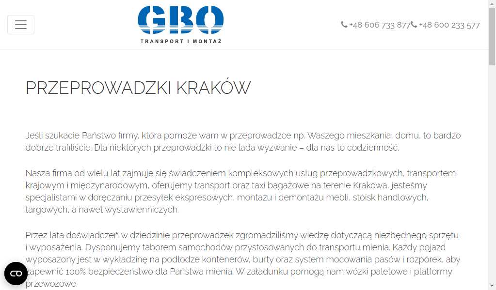 Firma GBO oferuje profesjonalne przeprowadzki na terenie miasta Kraków. Dzięki doświadczonej ekipie oraz nowoczesnym busom zapewniamy sprawny transport sprzętu w każdej sytuacji. Naszym priorytetem jest zadowolenie klientów i indywidualne podejście do każdego zlecenia. Jeśli szukasz taniej przeprowadzki – zapraszamy do kontaktu przez stronę: